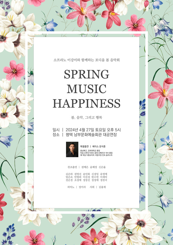 4월 27일 오후 5시 평택 남부문화예술회관 대공연장에서 ‘소프라노 이강미와 함께하는 포디움 봄 음악회’가 봄, 음악, 그리고 행복이라는 주제로 열린다.