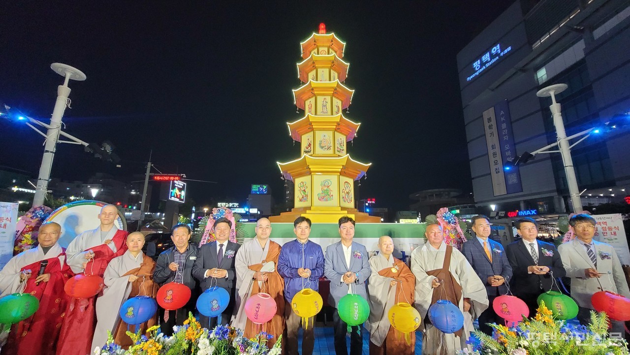 평택불교사암연합회는 4월 18일 평택역 광장에서 불기 2568년 부처님오신날 봉축탑 점등법회를 봉행했다.