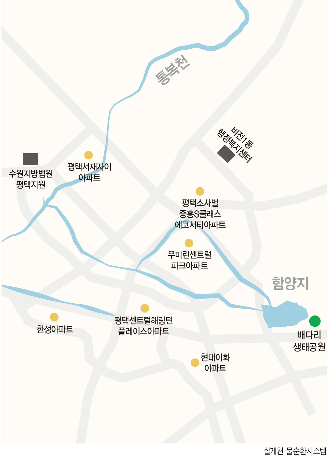 평택은 지명의 유래에 물과 습지가 숨어 있다. 한국토지공사가 평택 소사벌지구 택지개발사업을 설계하며 이화하수처리장 처리수를 배다리생태공원 상류에 있는 ‘함양지’ 작은 연못으로 끌어올려 재이용하는 계획을 포함했다.