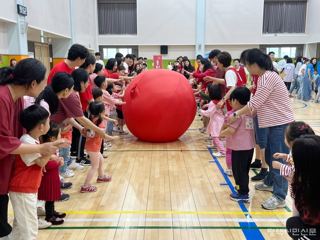 고덕초병설유치원은 4월 26일 고덕초교 체육관에서 가족과 함께하는 신나는 체육대회를 열었다. 이날 체육대회에 참여한 유아들과 학부모들이 공굴리기를 하며 즐거워하고 있다.