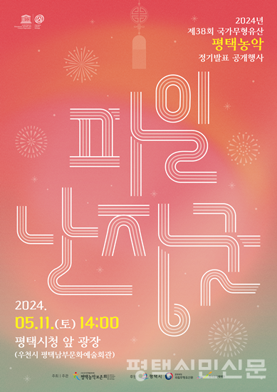 평택농악보존회가 2024년 제38회 평택농악 정기발표 공개행사 ‘파일난장굿’을 오는 5월 11일 오후 2시 평택시청 앞 광장에서 펼친다.
