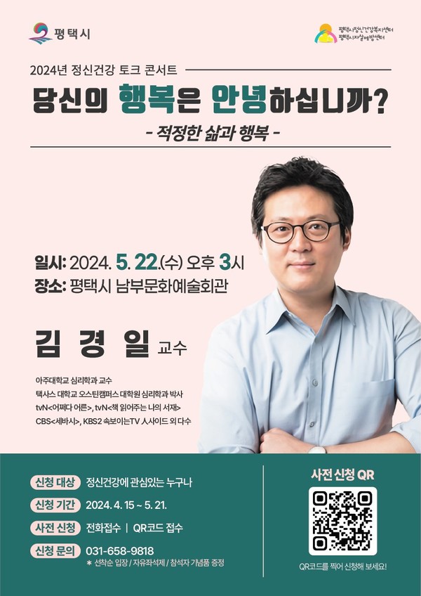 평택시정신건강복지센터는 5월 22일 남부문화예술회관에서 ‘당신의 행복은 안녕하십니까?’를 주제로 정신건강 토크콘서트를 개최한다.