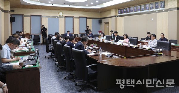 이날 시의원들은 평택시 행정구역 경계조정 연구용역, 평택국민외교센터 지정·설치계획, 평택시 환경복합시설 설치사업, 평택시공동주택관리지원조례 개정 추진, 하수도사용료 인상계획, 진위천유원지 물놀이장 철거부지 기본구상 용역 중간보고 등 6건의 안건을 검토하고 의견을 나눴다.