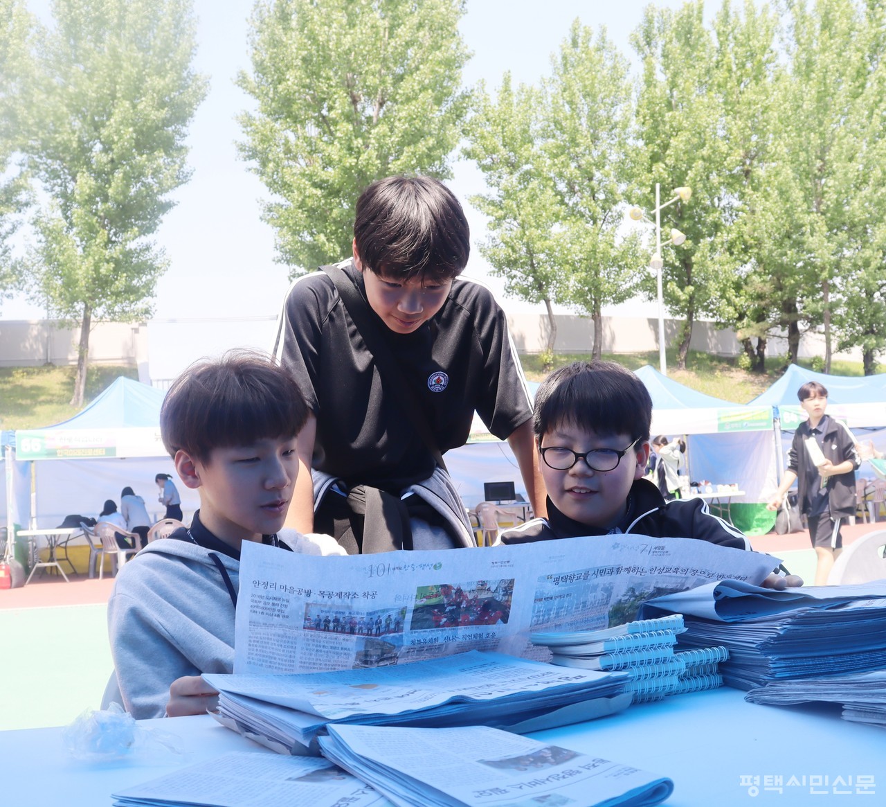 5월 10일 평택시 청소년진로박람회 ‘꿈날’을 찾은 비전중학교 학생들이 평택시민신문 부스에서 신문을 읽으며 의견을 나누고 있다. 꿈날은 소사벌레포츠타운에서 5월 9~10일 이틀간 개최됐다.