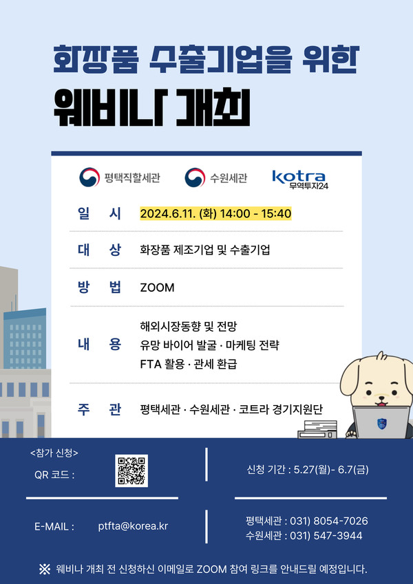 평택직할세관은 6월 11일 수원세관 및 코트라 경기지원단과 공동으로 ‘화장품 수출기업 지원 웨비나(웹을 활용한 온라인 세미나)’를 개최한다.