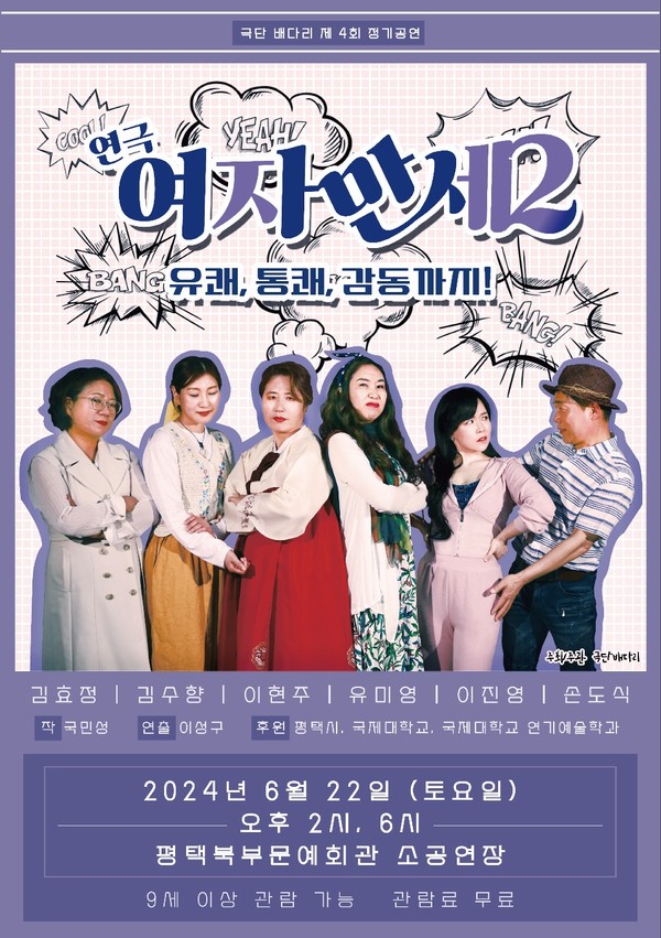 연극 ‘여자만세 2’가 6월 22일 오후 2시와 6시 평택북부문예회관 소공연장에서 공연된다. 이 연극은 극단 배다리가 주최하고 평택시와 국제대학교가 후원한다.