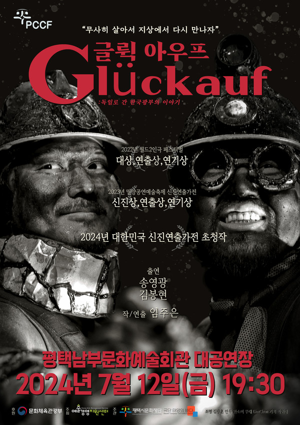 2인극 ‘글뤽 아우프(Glückauf)’가 7월 12일 오후 7시 30분 평택남부문화예술회관 대공연장에서 공연된다. 이 연극은 (재)예술경영지원센터가 주최하고 평택시문화재단과 극단 태양의 바다가 주관하며 문화체육관광부가 후원한다.
