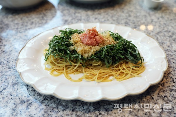 들기름 파스타는 명란과 날치알이 들어가 입안에서 톡톡 튀는 식감을 전해주며 그 위에 들기름과 잘게 썬 깻잎이 올라가 고소함을 더했다. 토지를 대표하는 메뉴이며 손님들뿐만 아니라 토지에서 일하는 직원들도 추천하는 메뉴이다.