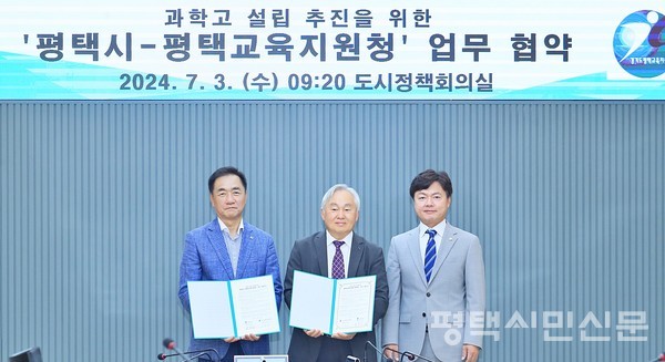 7월 3일 시청 도시정책회의실에서 열린 ‘과학고 설립 추진을 위한 업무협약식’에서 정장선 평택시장, 이종민 평택교육지원청 교육장, 김현정 국회의원(평택병)은 이 같이 밝혔다.