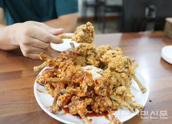 일단 모양새부터 남다르다. 먼저 길쭉한 뼈다귀가 눈에 들어온다. 뼈다귀 윗부분에는 깨끗한 기름에 먹음직스럽게 튀겨진 살집이 뭉쳐져 있다.