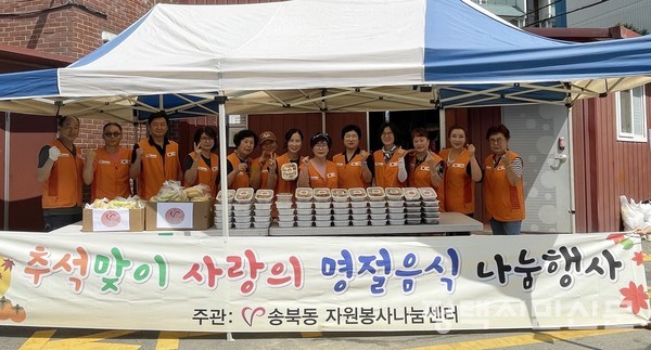 송북동 자원봉사나눔센터는 9월 3일 추석을 앞두고 송북동행정복지센터에서 어려운 이웃을 위한 ‘추석맞이 사랑의 명절 음식 나눔’을 실천했다