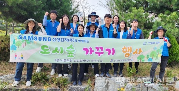 삼성전자 평택캠퍼스가 10월 8일 통복천 참여의숲에서 ‘도시숲 가꾸기 행사’를 진행했다고 10일 밝혔다.
