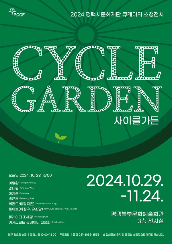 평택시문화재단 큐레이터 초청전 ‘사이클 가든(CYCLE GARDEN)’이 10월 29일부터 11월 24일까지 평택북부문화예술회관 전시실에서 개최한다.