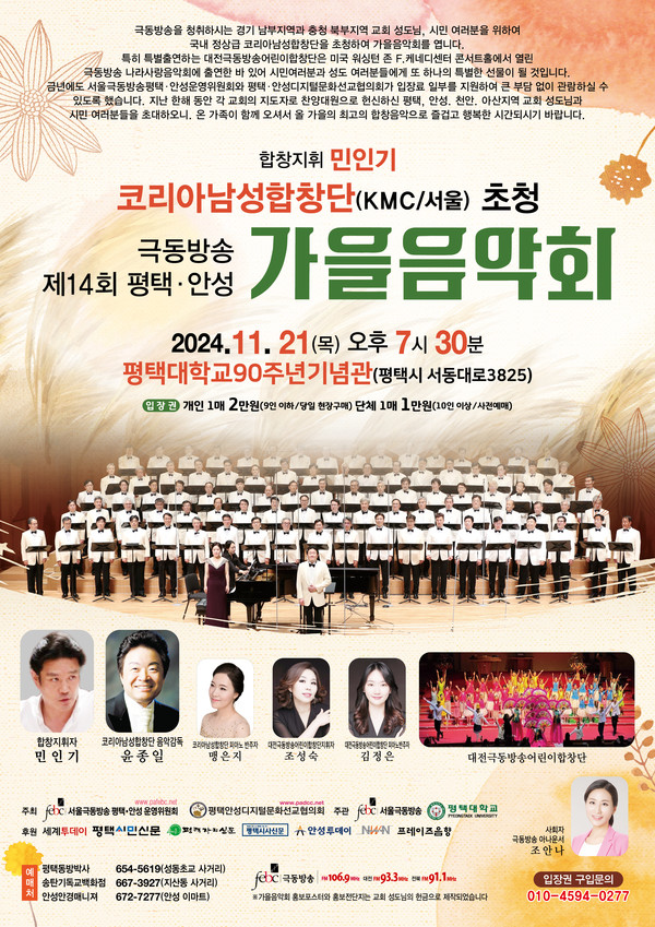 남성합창 특유의 중후한 매력으로 감동과 힐링을 전할 합창 공연이 열린다. 코리아남성합창단 초청 극동방송 제14회 평택·안성 가을음악회가 11월 21일 오후 7시 30분 평택대학교 90주년기념관에서 개최된다.