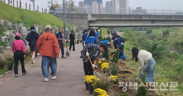 평택시는 평택 삼성전자와 함께 10월 28일 서정리천 하나로 산책로 주변 꽃 심기를 진행했다.