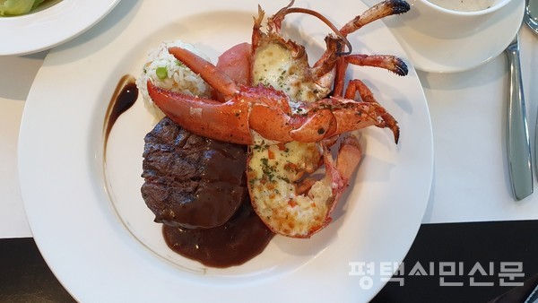 ■메뉴: 안심스테이크(110g)‧바닷가재구이 7만5000원, 안심스테이크(180g) 4만5000원, 안심스테이크(110g)‧왕새우구이‧생선가스 3만8000원