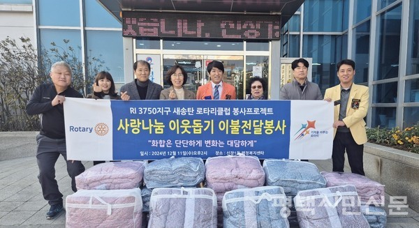 새송탄로타리클럽은 12월 11일 에너지 취약계층에게 전해달라며 신장1동행정복지센터에 겨울이불 18세트를 기부했다. 이날 기부는 새송탄 로타리클럽 봉사프로젝트의 하나로 추진됐으며 이불은 신장1동 지역사회보장협의체 위원들이 취약계층 가정을 방문해 전달하기로 했다.