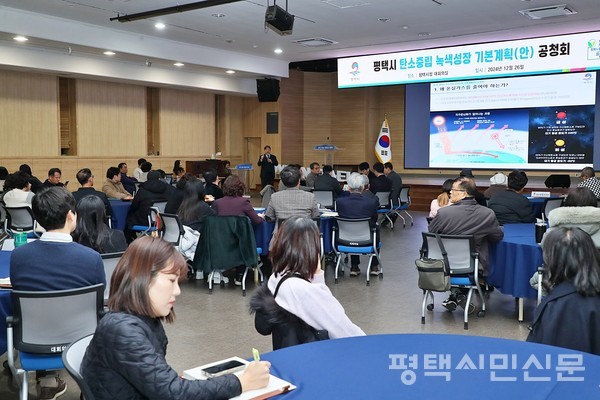 평택시가 오는 2030년까지 온실가스 42.9% 감축 목표를 담은 ‘평택시 탄소중립 녹색성장 기본계획’을 수립하기 위해 지난해 12월 26일 시청 대회의실에서 공청회를 열었다.