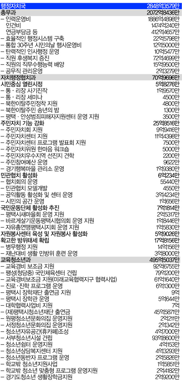 우선 시민중심 열린시정을 위해 5억8276만원이 집행된다. 통‧리장 사기진작 1억9570만원, 통‧리장 세미나 4500만원, 북한이탈주민정착 지원 4800만원, 북한이탈주민 송년의 밤 1300만원, 평택·안성범죄피해자지원센터 운영 지원 3500만원 등이 책정됐다.
