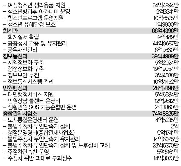 부서별로는 총무과 2072억8436만원, 자치행정협치과 70억9696만원, 교육청소년과 495억5037만원, 회계과 66억4396만원, 정보통신과 39억4989만원, 민원행정과 28억2198만원, 종합관제사업소 74억8825만원이 편성됐다. 부서별 주요사업 내용을 살펴보자.