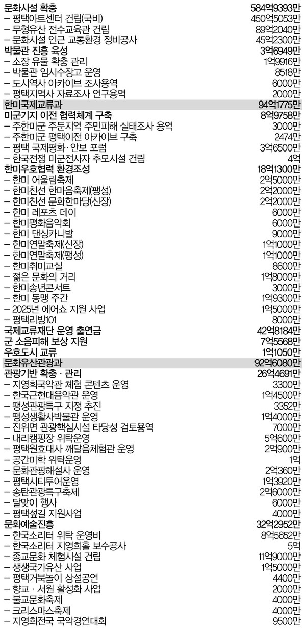 한미우호협력 환경조성에는 18억1300만원이 편성됐다. 한미 어울림축제 2억5000만원, 한미친선 한마음축제(팽성) 2억2000만원, 한미친선 문화한마당(신장) 2억2000만원, 한미 레포츠 데이 6000만원, 한미평화음악회 6000만원, 한미 댄싱카니발 9000만원, 한미연말축제(신장) 1억1000만원, 한미연말축제(팽성) 1억1000만원, 한미취미교실 8600만원, 젊은 문화의 거리 1억8000만원, 한미송년콘서트 3000만원, 한미 동맹 주간 1억9300만원, 2025년 에어쇼 지원 사업 1억5000만원, 평택리빙101 8000만원 등이 사용된다. 국제교류재단 운영 출연금으로 42억8184만원이 편성됐으며, 군 소음피해 보상 지원에 7억5568만원이 편성됐다. 우호도시 교류에는 1억1050만원이 사용된다. 특별회계 예산으로는 주변지역 주민편익시설사업 지원으로 방음시설 설치사업 차음량 측정 용역 8000만원, 방음시설 설치사업 보조금으로 7억원이 편성됐다.