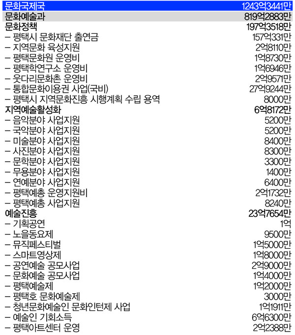 예술진흥에는 23억7654만원이 편성됐는데 기획공연 1억원, 노을동요제 9500만원, 뮤직페스티벌 1억5000만원, 스마트영상제 1억8000만원, 공연예술 공모사업 2억9000만원, 문화예술 공모사업 1억4000만원, 평택예술제 1억2000만원, 평택호 문화예술제 3000만원, 청년문화예술인 문화인턴제 사업 1억1911만원, 예술인 기회소득 6억6300만원, 평택아트센터 운영 2억2388만원 등이다.