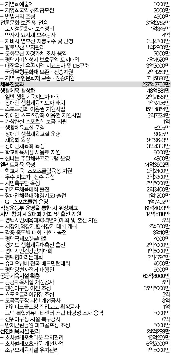 공공체육시설 확충 예산 63억8000만원을 살펴보면 공공체육시설 개선공사 15억원, 팽성야구장 이전 조성 35억5000만원, 스포츠클라이밍장 조성 2억원, 모곡족구장 시설 개선공사 3억원, 진위파크골프장 진입도로 확장공사 1억원, 고덕 복합커뮤니티센터 건립 타당성 조사 용역 8000만원, 진위야구장 시설 복구공사 6억원, 반제근린공원 파크골프장 조성 5000만원 등이다.