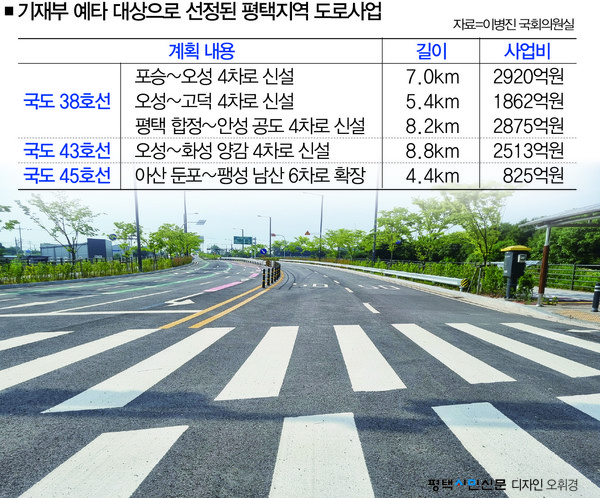 기재부 예타 대상으로 선정된 평택지역 도로사업 중 4개가 서부권의 도로 개선사업이다. 국도 38호선 포승~오성 4차로 신설(7km·2920억원), 국도 43호선 오성~화성 양감 4차로 신설(8.8km·2513억원), 국도 38호선 오성~고덕 4차로 신설(5.4km·1862억원) 국도 45호선 아산 둔포~팽성 남산 6차로 확장(4.4km·825억원) 등이 이에 해당한다.