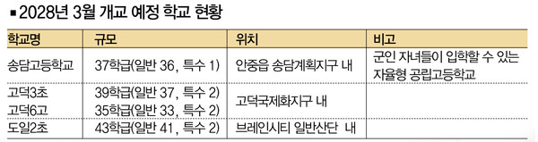 고덕3초는 39학급(일반 37, 특수 2) 규모로, 고덕6고는 35학급(일반 33, 특수 2) 규모로 각각 설립될 예정이다. 도일2초는 43학급(일반 41, 특수 2) 규모로 계획돼 있다.