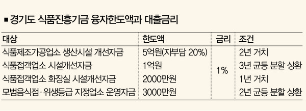 식품제조가공업소는 생산시설 개선자금 5억원(자부담 20%)을, 식품접객업소는 시설개선자금 1억원을 각각 지원받아 2년 거치 3년 균등 분할 상환하면 된다. 1년 거치 2년 균등 분할 상환조건으로 식품접객업소에 화장실 시설개선자금 2000만원을, 모범음식점·위생등급 지정업소에 운영자금 3000만원을 각각 융자해준다.