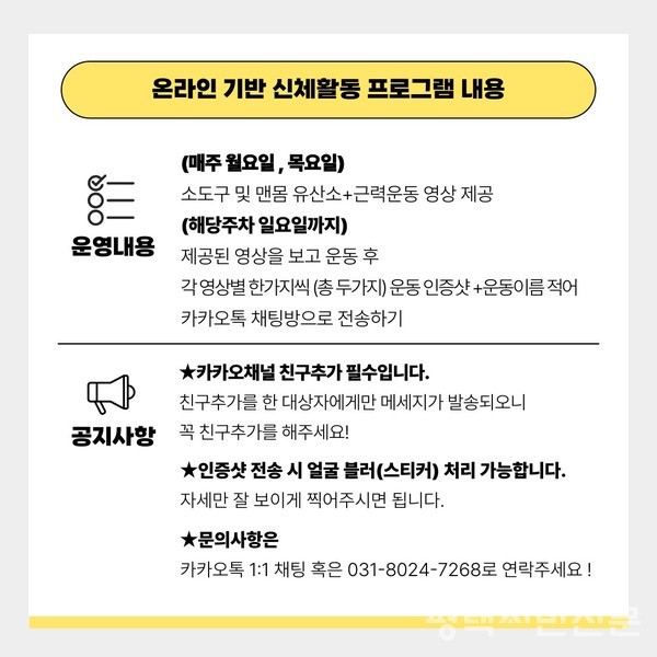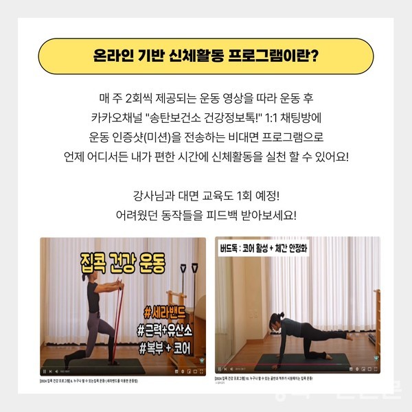 ‘온라인 기반 신체활동’ 프로그램은 매주 2회씩 제공되는 자체 제작 운동 영상을 따라 운동 후 인증 사진을 전송하고, 희망자는 기간 중 1회 강사와 대면 수업을 진행해 동작 피드백을 받는 대면, 비대면 혼합 프로그램이다.