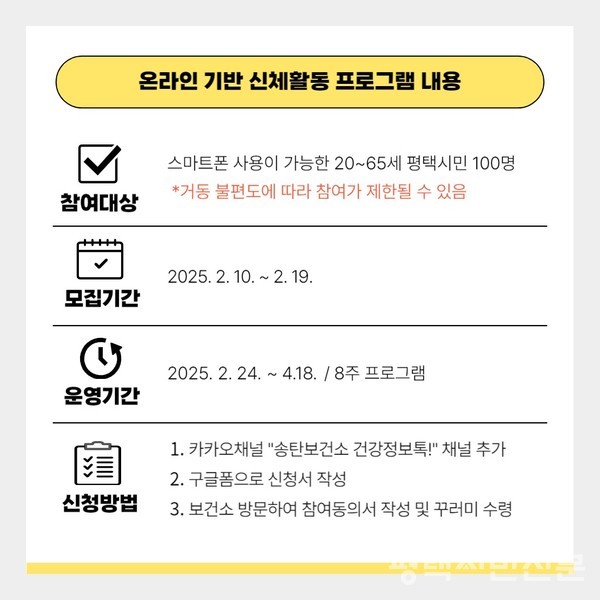 평택시 송탄보건소는 2월 10일부터 19일까지 ‘온라인 기반 신체활동’ 프로그램 참여자를 모집한다.