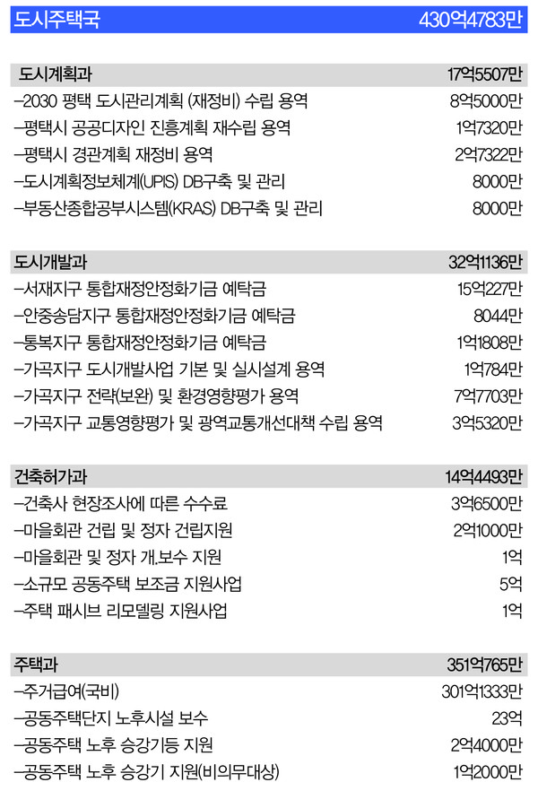 도시개발과 예산은 32억1136만원으로 지난해 33억1123만원과 비슷한 규모다. 일반회계 예산은 2억213만원으로 민간제안 도시개발사업 조합업무 회계검사 2200만원, 도시개발사업지원 1150만원, 행정운영경비 1억6313만원 등에 사용된다. 특별회계사업으로 서재지구토지구획정리사업 일반운영비 5000만원, 서재지구 통합재정안정화기금 예탁금 15억227만원, 안중송담지구토지구획정리사업 통합재정안정화기금 예탁금 8044만원, 통복지구도시개발사업 통합재정안정화기금 예탁금 1억1808만원, 가곡지구 도시개발사업 기본 및 실시설계 용역 1억784만원, 가곡지구 전략(보완) 및 환경영향평가 용역 7억7703만원, 가곡지구 교통영향평가 및 광역교통개선대책 수립 용역 3억5320만원 등이 편성됐다.