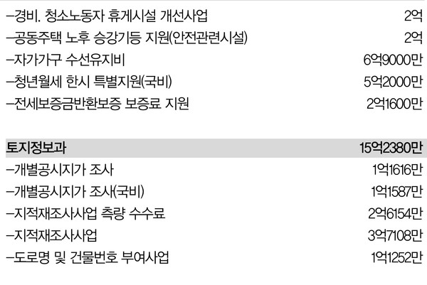토지정보과는 개별공시지가 조사 1억1616만원, 개별공시지가 조사(국비) 1억1587만원, 지적재조사사업 측량 수수료(국비) 2억6154만원, 지적재조사사업 3억7108만원, 도로명 및 건물번호 부여사업 1억1252만원, 도로명주소 기본도 유지관리(국가 직접지원) 6482만원, 국가주소정보시스템 유지관리(국가 직집지원) 5292만원, 주소정보시설 일제조사 7306만원, 부동산 관리체계 구축 8770만원, 시민편의 지적행정 운영 9117만원 등 15억2380만원을 쓴다.