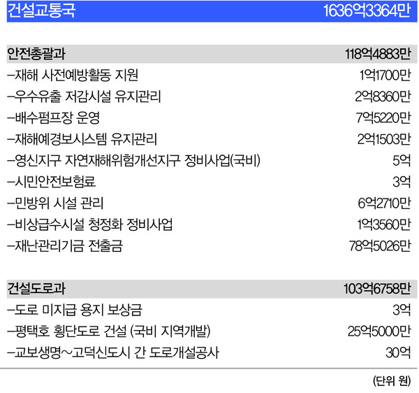 지방도 건설 및 확포장 사업, 도시계획도로 정비 등을 담당하는 건설도로과의 올 예산은 103억6758만원이다. 지난해 보다 56억5239만원이 감소했다. 도로 미지급 용지 보상금 3억원, 평택호 횡단도로 건설 (국비 지역개발) 25억5000만원, 교보생명~고덕신도시 간 도로개설공사 30억원, 안중대로3-7호선 도로개설공사(현화택지~현덕우체국간) 7억4000만원, 수촌지구 대로3-32호선 도로개설(수촌지구 민간도시개발사업)(부담금) 15억8000만원, 원정리(소로 1-1호선) 도시계획도로 개설공사 5억원, 안중대로 3-2호선 도로확포장공사 6억원, 지산동(소로1-207호선) 도시계획도로 개설공사 5억원, 팽성 농도305호선 도로개설공사 1억원 등이 배정됐다.