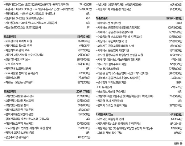운수업계 경영지원과 대중교통 기반시설 구축 사업을 펼치는 대중교통과 예산은 1040억4363만원이다. 지난해 822억9135만원보다 217억52287만원이 증가했다. 우선 운수업계 경영지원을 위해 722억8907만원이 투입된다. 지난해 보다 151억918만원이 증액된 수치다. 세부적으로 비수익노선 재정지원 240억원, 공영버스 운영결손금 지원(도비) 4억3102만원, 시내버스 공공관리제 운영(도직접지원) 100억9908만원, 시내버스 공공관리제 운영(도비) 56억7223만원, 수요응답형 버스(DRT) 운영비 지원(도비) 43억8000만원, 저상버스 구입비지원(국비) 37억6500만원, 고덕지구 광역교통특별대책 시행 8억1000만원, 시내버스 운송업체 재정지원 15억5239만원, 수도권 통합요금제 환승할인 손실금 지원 62억1182만원, 시내 및 마을버스 청소년요금 할인지원 4억5441만원, 시내버스 운송업체 경영 및 서비스 개선지원 3억7257만원, 어린이청소년교통비 지원사업 6억3836만원, 택시 카드결제수수료 지원 12억1829만원, 법인택시 운수종사자 처우개선(도비) 9억9072만원, The 경기패스(국비) 37억6000만원, 도시형교통모델(공공형버스) 운영지원(국비) 1억1000만원, 대광위 광역버스 준공영제 사업(국가직접지원) 36억5300만원, 광역버스 공공관리제 운영(도직접지원) 34억610만원 등이 사용된다.