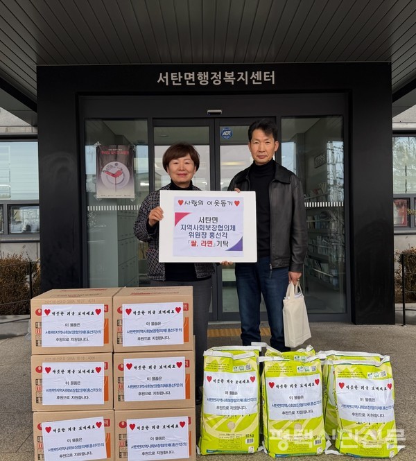 서탄면 홍선각 지역사회보장협의체 민간위원장이 정월대보름을 맞아 2월 12일 서탄면 행정복지센터에 백미(10㎏) 10포와 라면 10박스를 기부했다. 민간위원장은 2016년부터 서탄면 지역사회보장협의체 위원으로 활동하고 있으며, 2024년부터 서탄면 협의체를 이끌며 민관협력에 앞장서고 관내 자원발굴과 기부문화 확산을 위해 노력하고 있다. 이날 기부한 후원 물품은 소외계층과 홀몸노인 가구에 전달될 예정이다.