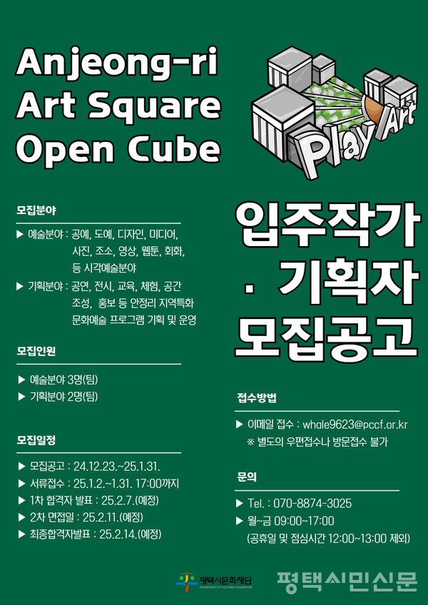 (재)평택시문화재단(대표이사 이상균)은 안정리 예술인광장 오픈큐브 5기 입주작가기획자 공모를 통해 총 5명(팀)을 선발했다. 이번 공모에는 총 17명(팀)이 지원해 3.4대1의 경쟁률을 보였으며, 서류심사와 면접심사를 거쳐 선발되었다. 최종 선발된 입주자는 작가 3명(팀)과 기획자 2명(팀)이다.