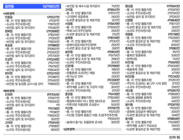 올해 전체 읍면동 예산은 192억6812만원으로 지난해 183억7526만원 보다 8억9286만원 증가했다. 읍면동 사업은 크게 주민 행정 편의 도모와 깨끗하고 아름다운 마을 조성 2개 분야다. 주민행정편의 도모분야는 주민참여예산 사업과 통·리·반장 활동지원, 민원행정 업무지원 등 주민생활편익지원사업, 청사 개·보수 및 유지관리, 구내식당 운영 등 청사관리 사업 등이다. 깨끗하고 아름다운 마을 조성 분야는 방역사업, 도로변 꽃길조성 및 제초작업, 소규모 주민숙원사업, 보안등 설치 및 유지관리, 각종 주요시설물 관리 등을 포함한다. 권역별로 읍면동 사업을 개략적으로 살펴본다.