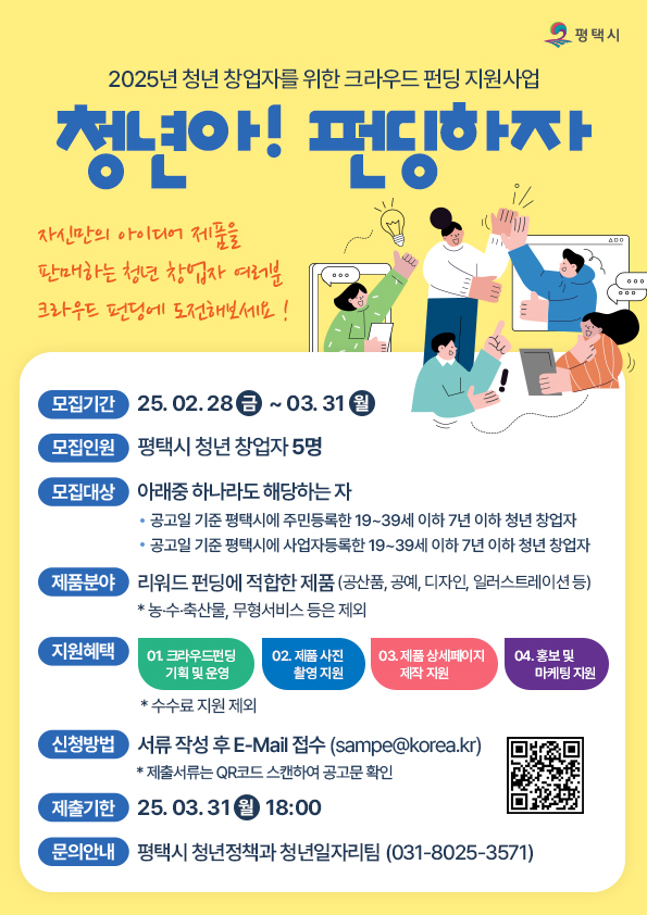평택시는 3월 7일 ‘2025년 청년 창업자를 위한 크라우드 펀딩 지원사업’ 참여자를 모집한다고 밝혔다.