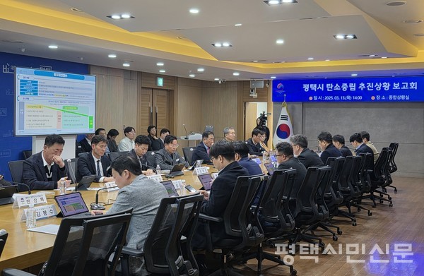 평택시가 3월 13일 ‘평택시 탄소중립 추진 상황 보고회’를 열고 2030년까지 2018년 대비 온실가스를 42.9% 감축하는 목표를 재확인했다.