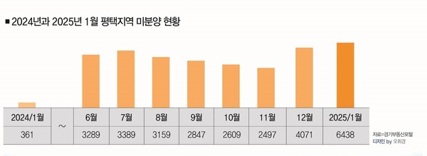 국토교통부와 경기도 주택정책과가 집계한 ‘미분양 주택 현황’에 따르면 평택지역의 미분양 세대는 지난 1월 31일 기준 6438세대로 확인됐다. 경기도 내 미분양 세대 수 1만135세대의 42.5%에 해당하고, 361세대로 집계됐던 2024년 1월 31일과 비교하면 약 18배 급증한 수치다. 특히 2024년 11월 30일 2497세대, 12월 31일 4071세대 등으로 증가세가 수그러들지 않고 있다.