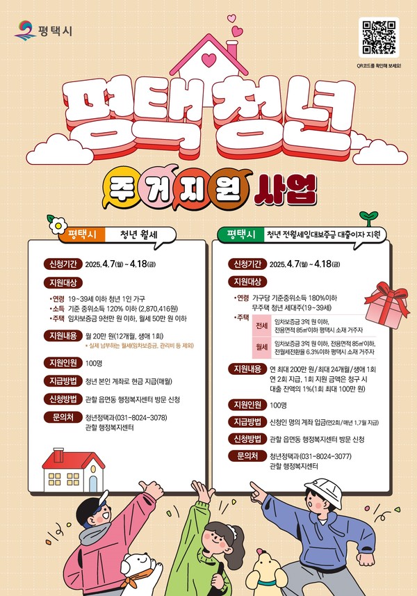 평택시는청년의 주거비 부담을 완화하고 사회진입을 지원하는 ‘청년 월세 지원’ 사업 신규 대상자를 4월 7∼18일 모집한다.