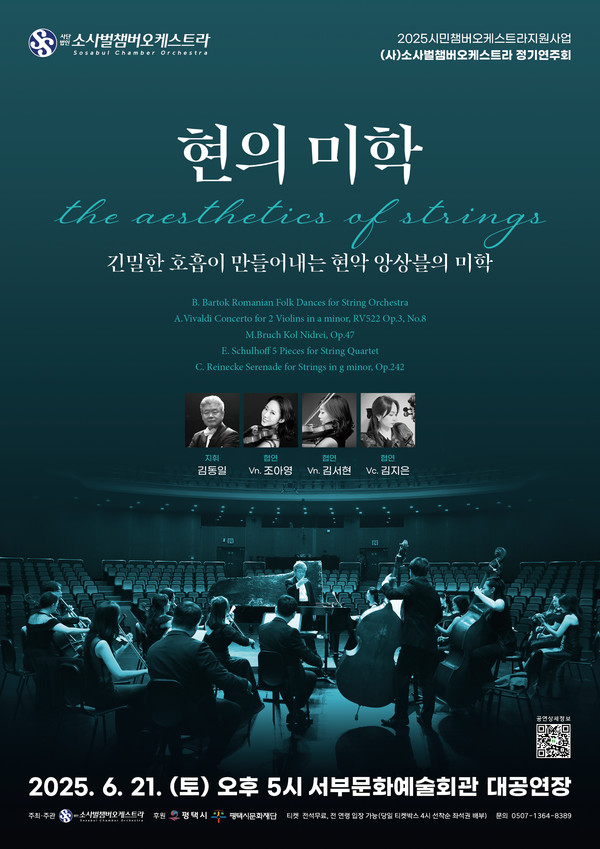 소사벌챔버오케스트라 정기연주회가 6월 21일 오후 5시 서부문화예술회관 대공연장에서 펼쳐진다. 이번 연주회는 ‘현의 미학’을 주제로 긴밀한 호흡이 만들어내는 현악 앙상블의 미학을 선보인다.