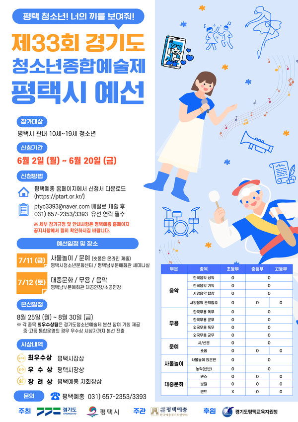 평택예총은 6월 2일부터 시작해 20일까지 ‘제33회 경기도청소년종합예술제’ 평택시 예선 참가자를 모집한다. 이번 대회는 경기도와 평택시가 공동 주최하고, 평택예총이 주관하며 경기도평택교육지원청이 후원한다.