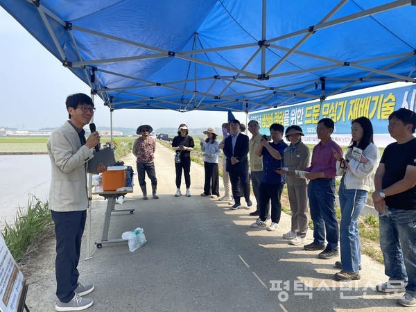 평택시 농업기술센터는 5월 28일 포승읍에서 ‘벼 드문모심기 재배 기술 현장 연시회’를 개최했다.