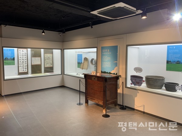 또한 ‘세종실록 지리지’, ‘대동방여전도’ 등 고문헌 자료와 함께 체, 키, 뒤주, 시루 등 팽성에서 실제 사용된 생활 유물들이 전시된다. 특히, 100여 년 전부터 대를 이어 사용해 온 기증 유물인 뒤주는 들에서 수확된 곡식에서 가정의 일상으로 이어지는 삶의 흐름을 상징하는 대표적인 유물이다.