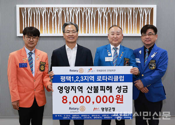 이날 성금은 지난 3월 경북 지역 대형 산불로 삶의 터전을 잃은 영양군민들을 돕고자 평택1·2·3지역 로타리클럽 회원들이 자발적으로 참여해 마련됐다.