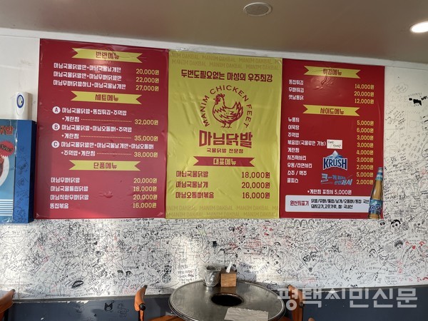 용이동 평택대학교 후문 먹자골목 식당들 사이에서 노란 간판의 가게가 눈에 들어온다. 가게 벽면에는 장난기 가득한 대학생들의 낙서가 특유의 대학가 맛집의 분위기를 자아낸다.