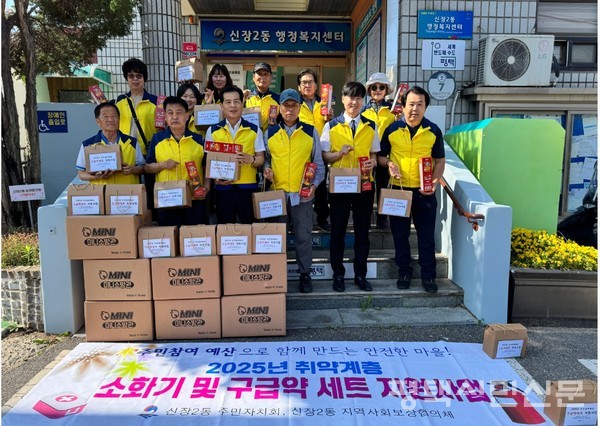 신장2동 주민자치회·지역사회보장협의체는 6월 11일부터 13일까지 사흘간 화재 취약계층 565가구에 소화기를 설치하고 구급약 세트를 지원했다.